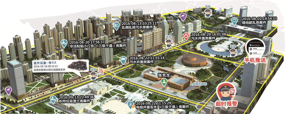 智慧城管管控平臺依托統(tǒng)一的三維地理信息平臺,基于“43221”理論,結(jié)合城市管理部門業(yè)務(wù),將管理單元按照一定的標準劃分成為單元網(wǎng)格。安排網(wǎng)格監(jiān)督員對單元網(wǎng)格的部件和事件巡查,建立一種監(jiān)督和處置互相分離的形式。主要優(yōu)勢是能夠主動發(fā)現(xiàn)并及時處理各類問題,加強管理能力和處理速度,將問題解決在事故發(fā)生之前。
