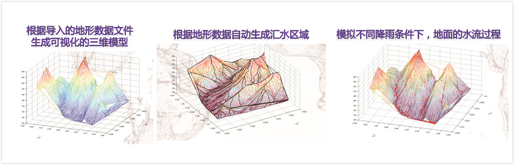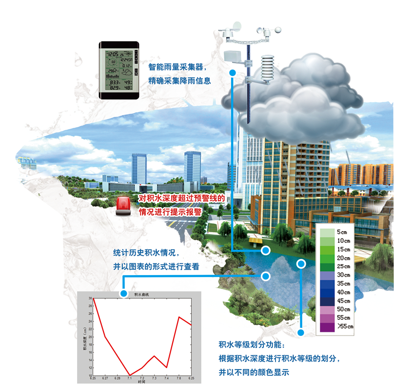 本系統(tǒng)應(yīng)用三維地理信息技術(shù),建立匯水區(qū)域自動(dòng)生產(chǎn)模型,充分考慮地面滲透、土地利用、地面粗糙程度等因素對(duì)地面水流流動(dòng)的影響,在數(shù)字化排水管網(wǎng)以及排水設(shè)施資料的基礎(chǔ)上,應(yīng)用水動(dòng)力學(xué)原理以及雨量排出平衡原理,結(jié)合氣象預(yù)報(bào)數(shù)據(jù),模擬不同降雨條件下城市地面以及排水管道徳水量和水位變化,達(dá)到給水預(yù)測(cè)的目的,對(duì)積水深度超過(guò)預(yù)警線的情況提供報(bào)警。