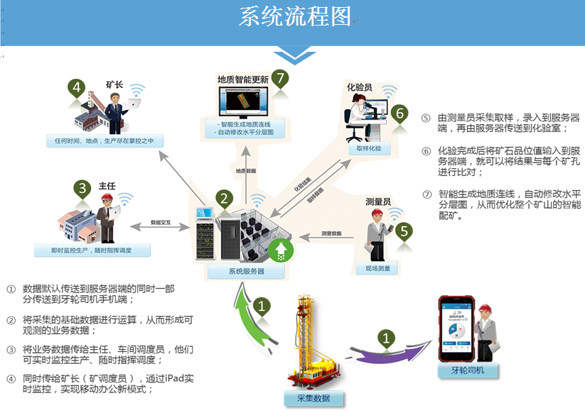 基于“43211”理論的《聚進(jìn)牙輪生產(chǎn)智能管控系統(tǒng)》以聚進(jìn)露天三維采礦綜合信息系統(tǒng)為基礎(chǔ),引進(jìn)高精度智能測(cè)量設(shè)備,提高測(cè)量精度,數(shù)據(jù)采集及時(shí)準(zhǔn)確,極大提高生產(chǎn)工作效率。徹底解決礦山測(cè)量人手不足,戶(hù)外測(cè)量工作量大的頑固難題,極大提高測(cè)量數(shù)據(jù)的單位采集率,建立公司級(jí)數(shù)據(jù)應(yīng)用交換平臺(tái),支持?jǐn)?shù)據(jù)和圖像同時(shí)傳輸,地質(zhì)模型實(shí)時(shí)更新、資源信息遠(yuǎn)程共享,實(shí)現(xiàn)過(guò)程控制數(shù)字化,可使操作者直觀立體地感知生產(chǎn)過(guò)程及現(xiàn)場(chǎng)狀況。